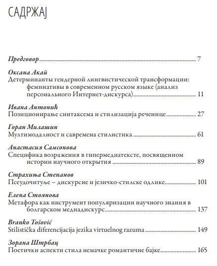 Brankо Tošovića (u redakciji) Savremena južnoslovenska metastilistika i metapoetika Autori: Branko Tošović, Darin Angelovski, Marina Biti, Evdokija Borisova, Aleksandra Đurkova, Radoje Femić, Marija Ilijeva, Desislava Ivanova, Nataša Jovović, Slavčo Koviloski, Nenad Krcić, Tamara Labudović, Daniela Marot Kiš, Goran Milašin, Milana Poučki, Teodora Rabovjanova, Saša Simović, Svetlana Slijepčević Bjelivuk, Saša Stanić, Strahinja Stepanov, Diana Stolac, Amela Šehović, Lidija Tanturovska, Miodarka Tepavčević, Olga Vojičić-Komatina Beograd – Grac/Graz Stilistička komisija Međunarodnog slavističkog komiteta – Institut für Slawistik der Karl-Franzens-Universität Graz – Aletea 2024 580 s. Serija Slovenska stilistika, tom 2 ISBN 978-3-9519973-1-5 (Institut für Slawistik der Karl-Franzens-Universität Graz) ISBN 978-86-82644-18-7 (Aletea) |